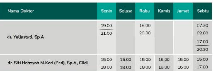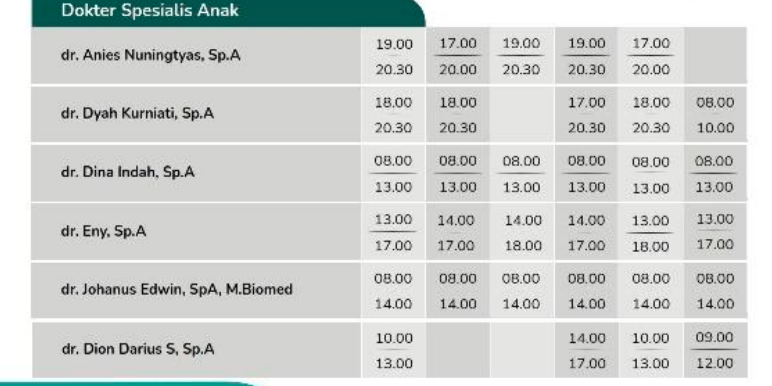 Disclaimer: Untuk jadwal dokter anak RS Alia Pondok Bambu yang terbaru dan akurat, kunjungi situs web resmi rumah sakit atau hubungi nomor telepon yang tersedia.