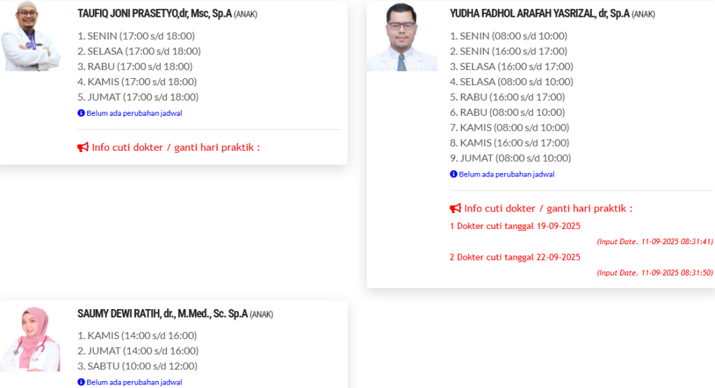 - Selalu konfirmasi jadwal terbaru melalui website resmi atau telepon ke rumah sakit/klinik yang bersangkutan.