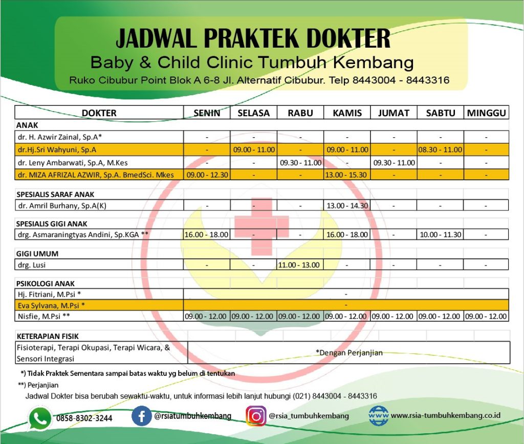 - Beberapa dokter mungkin memiliki jadwal praktik di klinik lain di luar RS TKA Cimanggis. Tanyakan kepada pihak rumah sakit untuk informasi lebih lanjut.