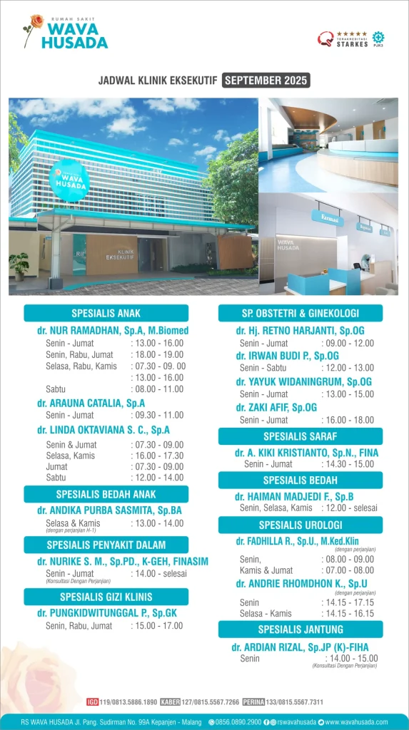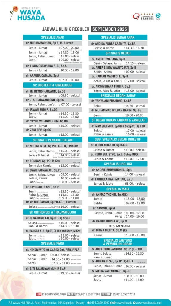 - Sebaiknya hubungi Wava Husada Kepanjen terlebih dahulu untuk mengonfirmasi jadwal dokter dan membuat janji.