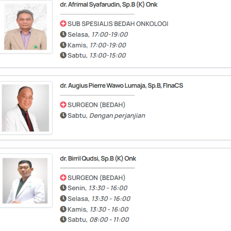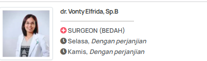- Pastikan dokter memiliki gelar Spesialis Bedah (Sp.B) yang sah dan terdaftar di Ikatan Dokter Indonesia (IDI).