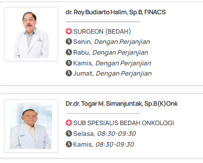 - Prosedur: Pilih poli bedah umum, pilih dokter dan waktu yang tersedia dari jadwal dokter bedah umum RS Kramat 128, isi data diri, dan konfirmasi. Anda akan mendapatkan nomor antrean atau konfirmasi janji.