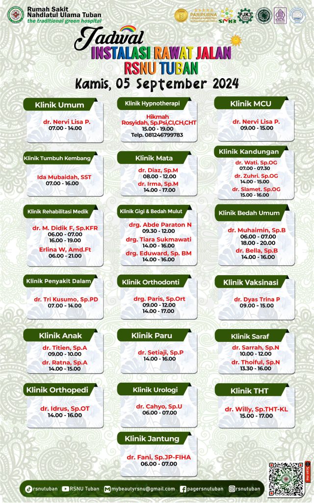 - Jadwal di atas adalah contoh dan bisa berbeda. RS NU Tuban mungkin memiliki lebih dari jumlah dokter yang disebutkan, atau jadwal yang lebih padat pada hari-hari tertentu.