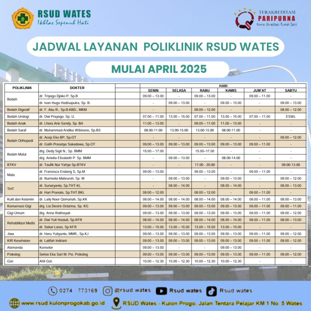 - Telepon: Anda dapat menghubungi nomor telepon poliklinik bedah umum atau call center RSUD Wates untuk menanyakan jadwal dan melakukan pendaftaran. Petugas akan membantu Anda mencatat informasi dan memberikan jadwal praktik dokter.