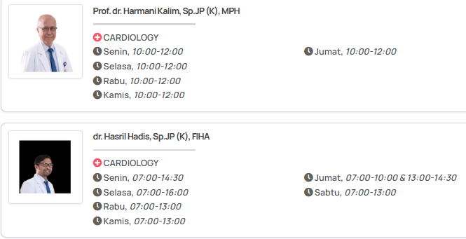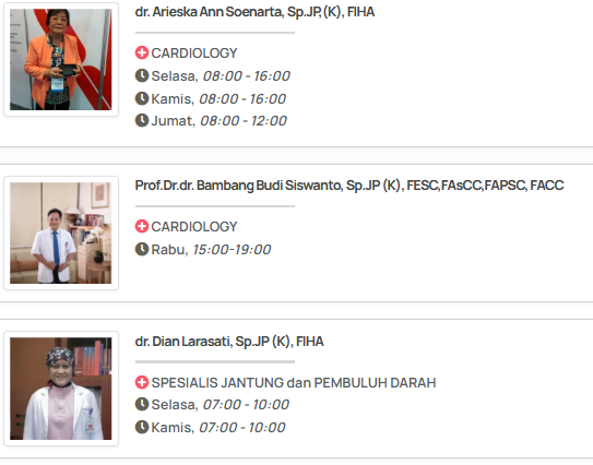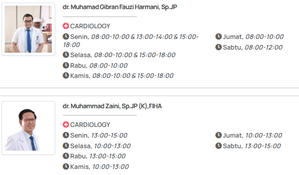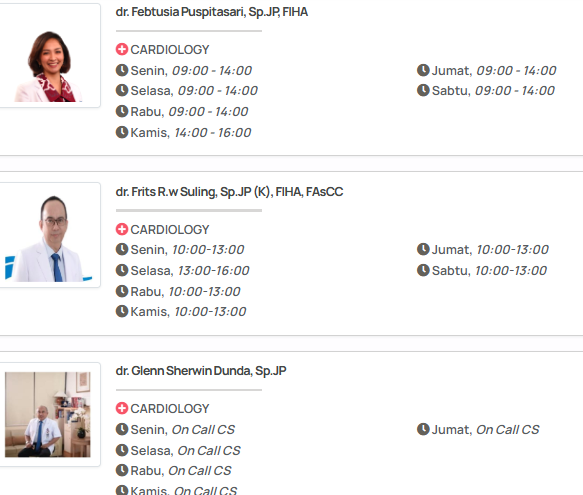 - Cek ketersediaan dokter spesialis jantung gunakan fitur “Cari Dokter” di situs RS untuk memilih dokter sesuai spesialisasi (kardiologi umum, intervensi, ekokardiografi, dsb).