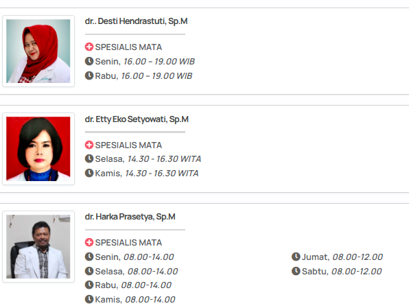 - Biaya konsultasi dokter mata bervariasi tergantung pada dokter spesialis dan jenis layanan yang diberikan. Sebaiknya tanyakan langsung kepada pihak rumah sakit untuk informasi biaya yang lebih akurat.