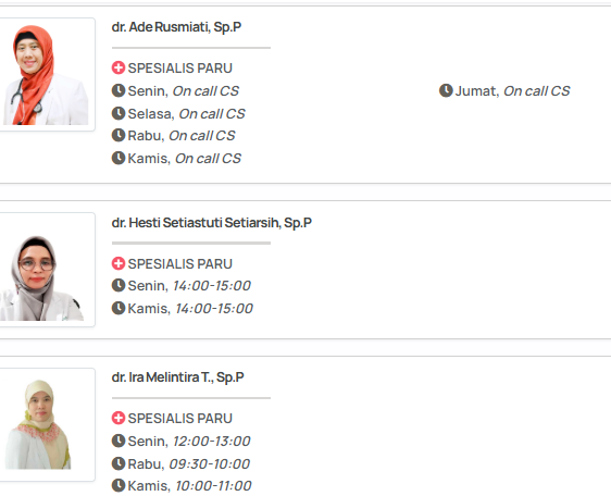 - dr. Rina Puspita, Sp.P: Beliau adalah dokter spesialis paru dengan fokus pada penanganan asma, Penyakit Paru Obstruktif Kronis (PPOK), dan alergi pernapasan. Dengan pendekatan yang ramah dan teliti, dr. Rina sangat cocok bagi pasien yang membutuhkan edukasi mendalam mengenai manajemen penyakit kronis.