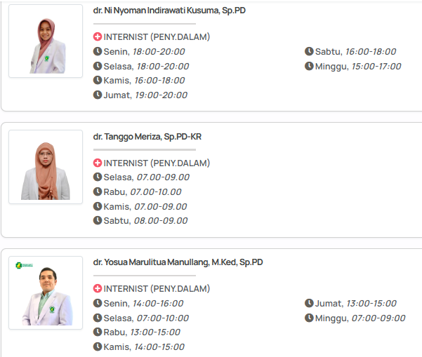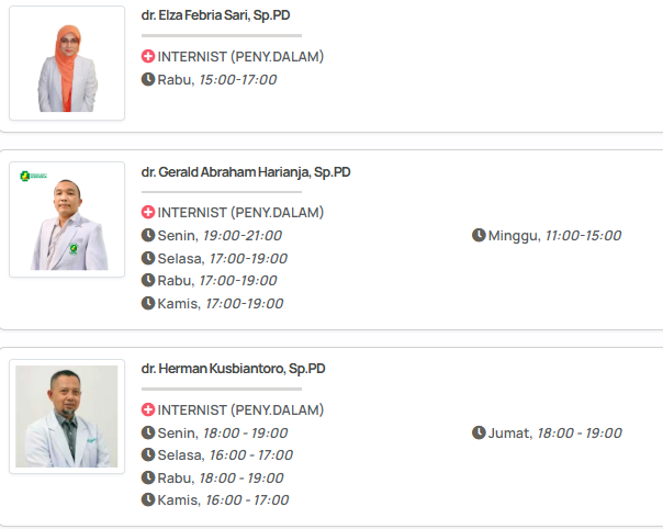 Apakah jadwal dokter penyakit dalam bisa berubah?Ya, jadwal dokter dapat berubah sewaktu-waktu karena berbagai alasan. Sebaiknya selalu konfirmasikan jadwal sebelum membuat janji.