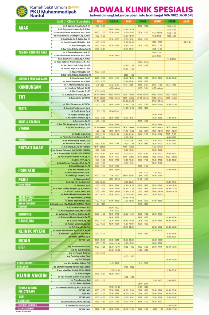 A1: Cara terbaik adalah dengan menghubungi langsung nomor telepon pendaftaran Rumah Sakit PKU Muhammadiyah Bantul atau memeriksa website resmi mereka. Jadwal bisa berubah sewaktu-waktu, jadi konfirmasi selalu penting.