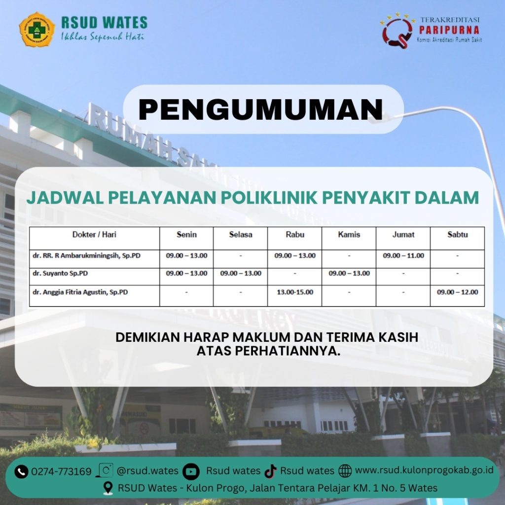 RSUD Wates sebagai salah satu fasilitas kesehatan terkemuka di Kabupaten Kulon Progo, terus berkomitmen untuk memberikan pelayanan medis terbaik bagi masyarakat. Salah satu departemen krusial yang menjadi tumpuan pelayanan adalah Departemen Penyakit Dalam. Bagi Anda yang membutuhkan konsultasi, diagnosis, atau penanganan berbagai kondisi medis yang berkaitan dengan organ dalam, mengetahui jadwal praktik dokter spesialis penyakit dalam di RSUD Wates adalah langkah awal yang penting. Artikel ini akan mengulas secara mendalam tentang jadwal dokter penyakit dalam RSUD Wates, sistem pendaftaran, jenis pelayanan yang tersedia, kuota pasien, hingga tips memilih dokter yang tepat.
