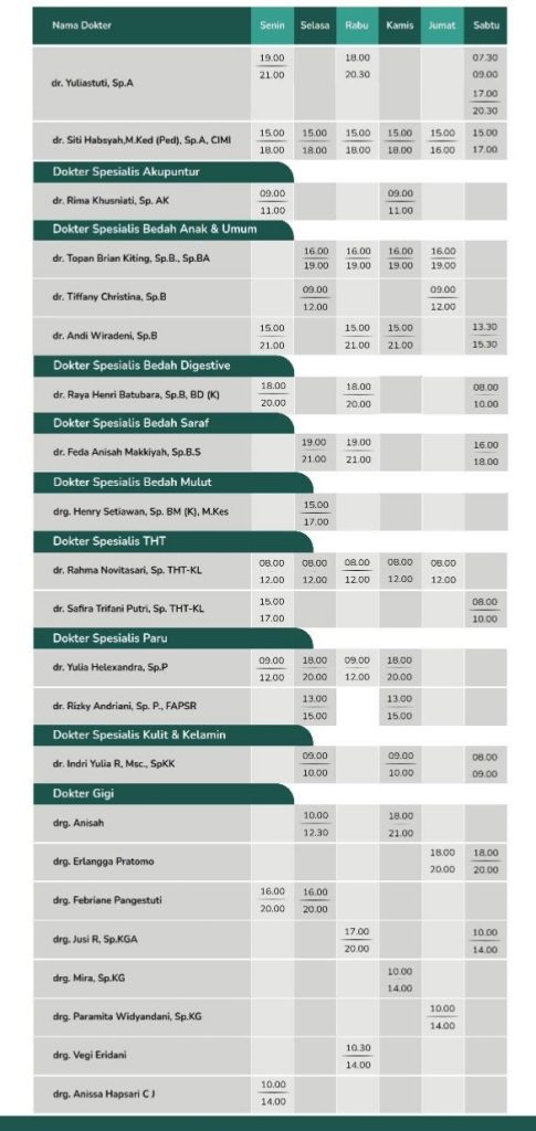 - Menghubungi Langsung Klinik: Telepon ke nomor resmi Klinik Alia Pondok Bambu untuk menanyakan jadwal dokter spesialis atau dokter umum yang Anda butuhkan.