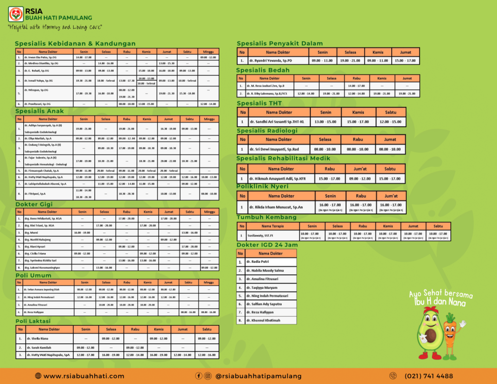 - Pastikan untuk menghubungi Buah Hati Pamulang untuk mendapatkan jadwal dokter yang paling akurat dan terkini.