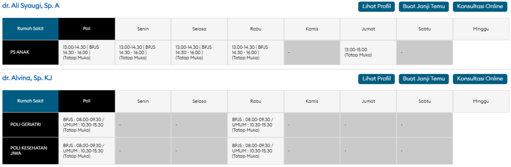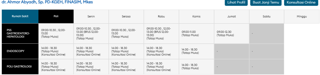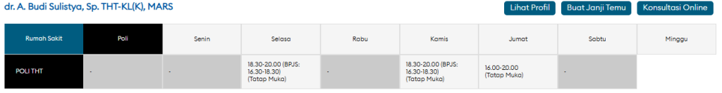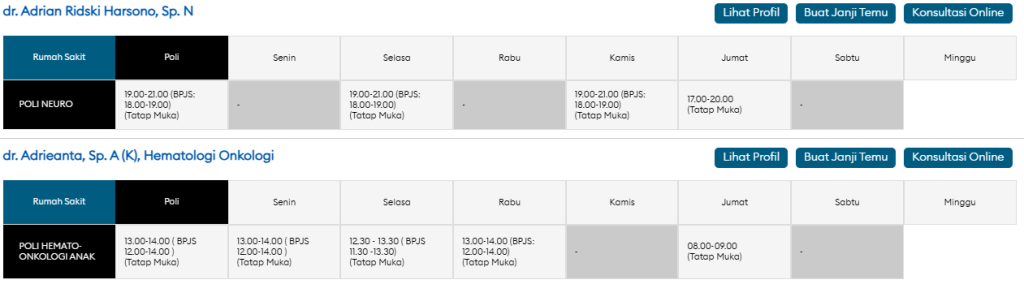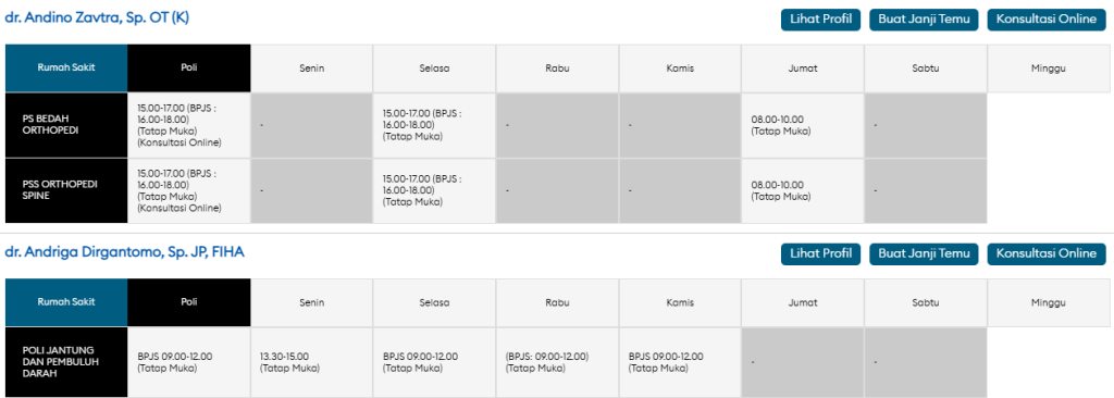 - Langkah 5: Lihat Detail Jadwal. Setelah melakukan pencarian, Anda akan melihat daftar dokter beserta jam praktik, hari, dan lokasi praktik (misalnya, Poliklinik A, Lantai 2). Perhatikan juga informasi mengenai status praktik (misalnya, sedang cuti, penuh, dll.).