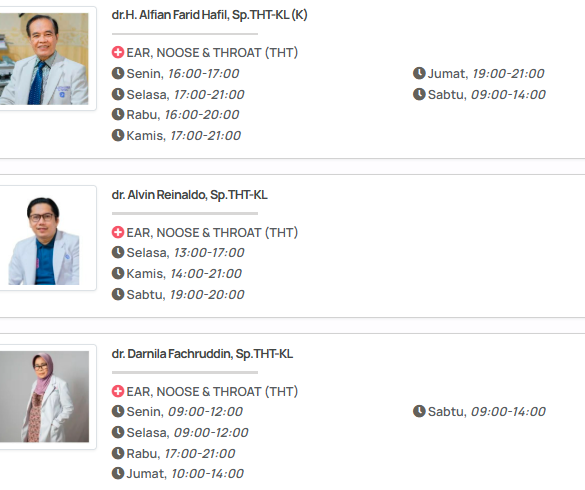 - Spesialisasi: Beberapa dokter THT memiliki spesialisasi tertentu, seperti rhinologi (hidung dan sinus), otologi (telinga), atau laringologi (tenggorokan dan suara). Pilih dokter yang memiliki spesialisasi yang sesuai dengan masalah Anda.