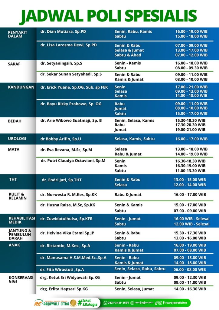 - Jadwal dokter dapat berubah sewaktu-waktu. Cara terbaik adalah dengan menghubungi RS Rajawali Citra Yogyakarta melalui telepon atau mengunjungi website resmi mereka untuk mendapatkan informasi terbaru.