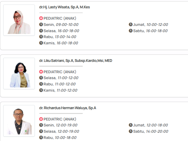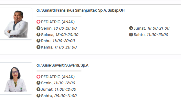Berikut adalah tabel jadwal praktek dokter anak di RS Hermina Bogor. Jadwal ini dapat berubah sewaktu-waktu, jadi disarankan untuk selalu melakukan konfirmasi terlebih dahulu sebelum datang.